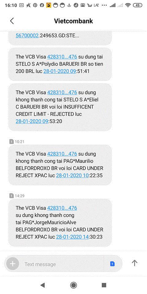 Cụ thể, anh L.H.K (ở Quảng Bình) cho biết: "Sáng 28/1, tôi đang lái xe thì nhận được hàng loạt tin nhắn từ dịch vụ SMS Banking của Ngân hàng Ngoại thương Việt Nam (Vietcombank), báo tài khoản của anh đã bị trừ tiền vì giao dịch qua thẻ. Sau đó là những tin nhắn khác báo giao dịch không thành công vì tài khoản tôi không đủ tiền".