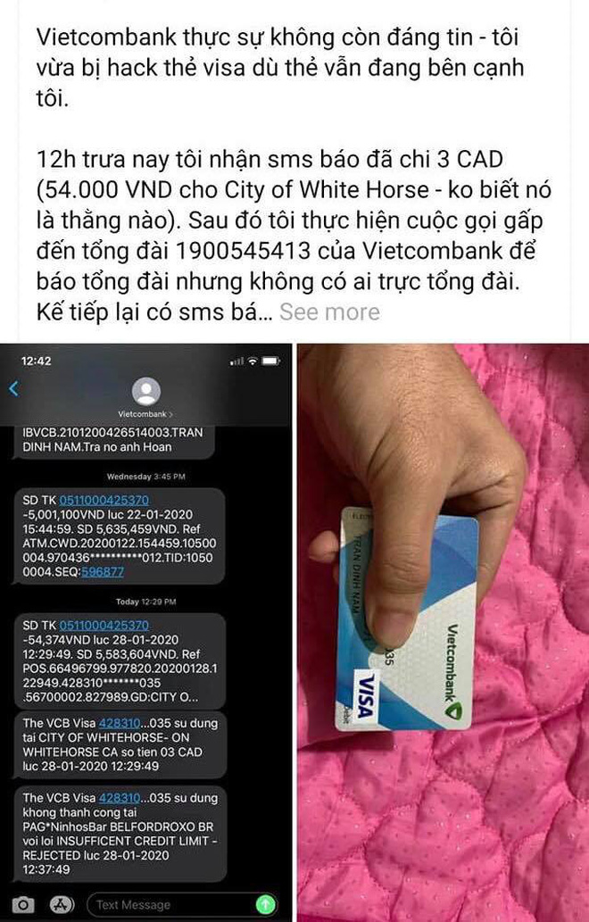 Ghi nhận của báo Lao động thủ đô, trong ngày 28/1 (mùng 4 Tết), một số khách hàng dùng thẻ VISA của Vietcombank đồng loạt cho biết bị mất tiền trong khi không hề giao dịch và thẻ vẫn đang nằm trong ví.