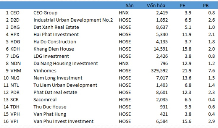 Theo thống kê của KIS, cổ phiếu của nhiều doanh nghiệp bất động sản có chỉ số P/E thấp như: HDG (3,7 lần), VPH (3,8 lần), LDG (3,8 lần), CEO (3,9 lần), DXG (5,1 lần)…; chỉ số P/B thấp như: SCR (0,4 lần), VPH (0,4 lần), TDH (0,6 lần), LDG (0,8 lần), CEO (0,8 lần)…