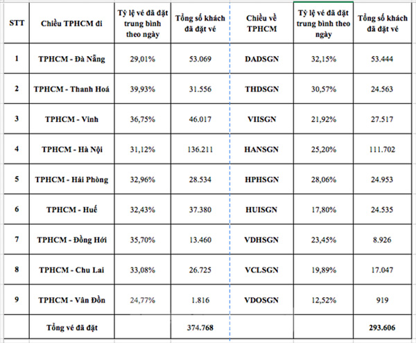 Tính tới ngày 12/12, các đường bay kết nối TPHCM với các tỉnh thành miền Trung, phía Bắc trong 1 tháng Tết Nguyên đán đã bán được tổng số 668.374 vé. Trong đó, giai đoạn trước Tết tập trung các ngày từ 17-19/1/2023 (tức 26-28 Tết), giai đoạn sau Tết tập trung các ngày từ 27-29/1 (tức từ mùng 6-8 Tết), với tỷ lệ vé đã đặt chiếm 70-90% tổng số vé các hãng bán ra. Tập trung cao điểm vào các đường bay TPHCM - Hải Phòng, TPHCM - Thanh Hoá, TPHCM - Vinh (Nghệ An), TPHCM - Đồng Hới (Quảng Bình)…