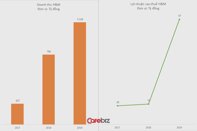 Sang năm 2018 doanh thu H&M tăng gấp 3 lần, lên 763 tỷ đồng và năm 2019 tăng tiếp lên 1.116 tỷ đồng. Lợi nhuận sau thuế của hai năm này tăng so với 2017 nhưng cũng ở mức rất thấp, là 11 tỷ đồng và 57 tỷ đồng trong bối cảnh tỷ suất lợi nhuận gộp ổn định ở mức 65-66%.