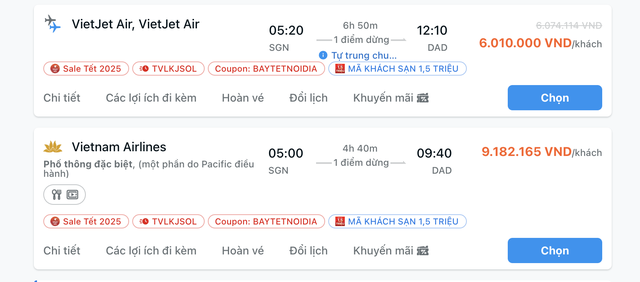 Theo khảo sát sáng 13-1, chặng TP HCM - Đà Nẵng ngày 24-1 (25 tháng Chạp) của Vietjet còn vé nối chuyến qua Hà Nội với giá 6,1 triệu đồng/chặng, trong khi Vietnam Airlines cung cấp vé nối chuyến tương tự với giá từ 9,3 triệu đồng/chặng.