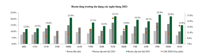 Bên cạnh đó, một số ngân hàng hiện chưa được nới room ở đợt cấp mới quý 4/2021 do NHNN vẫn đang tiếp tục xem xét. Nhiều khả năng các ngân hàng này sẽ được cấp bổ sung room tăng trưởng tín dụng trong giai đoạn cuối năm 2021. Các tiêu chí xét duyệt tín dụng của NHNN có thể kể đến như mức độ dồi dào vốn chủ sở hữu (thể hiện qua hệ số CAR), năng lực quản trị rủi ro (thể hiện qua việc tuân thủ các chuẩn mực Basel II, Basel III, IFRS 9…), mức độ hỗ trợ xã hội trong giai đoạn nền kinh tế khó khăn (thông qua miễn giảm lãi suất và phí).