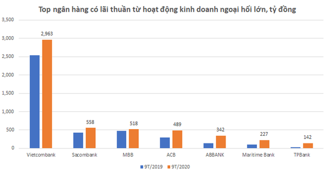 Ngân hàng TMCP Ngoại thương Việt Nam (mã: VCB, Vietcombank) tiếp tục là ngân hàng mạnh trong lĩnh vực kinh doanh ngoại hối khi ghi nhận 2.963 tỷ đồng lãi thuần trong 9 tháng đầu năm 2020, riêng trong quý 3 đóng góp 1.034 tỷ đồng, tăng trưởng lần lượt 16,9% và 14% so với cùng kỳ năm trước.