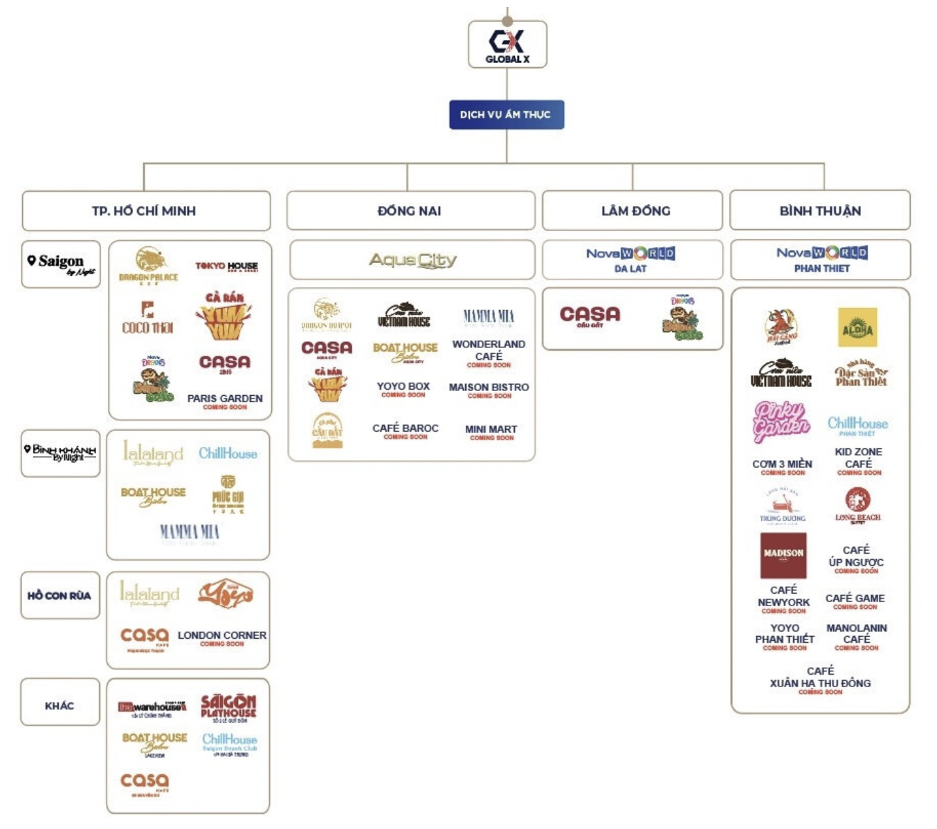 Công ty hoạt động trong 3 lĩnh vực chính là Ẩm thực, Beer Garden và Cafe. Chỉ một thời gian ngắn, GLOBAL X đã "phủ sóng" với loạt thương hiệu Lalaland, Casa,Tokyo House, Nova Dreams Cafe... không chỉ ở Tp.HCM, mà còn lan về các tỉnh Đồng Nai, Lâm Đồng và Bình Thuận (nơi đặt các khu du lịch của Nova).