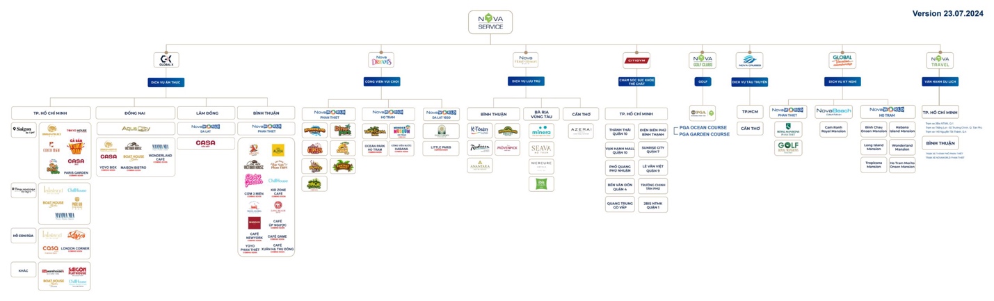 Theo thông tin trên Website, Nova Service cho biết đang quản lý và khai thác 20 nhà hàng ẩm thực quy mô 10.000 chỗ ngồi, 10 khách sạn với 1.500 phòng, 7 công viên giải trí quy mô từ 2-10 ha, 1 sân golf PGA 36 lỗ và 10 phòng gym.