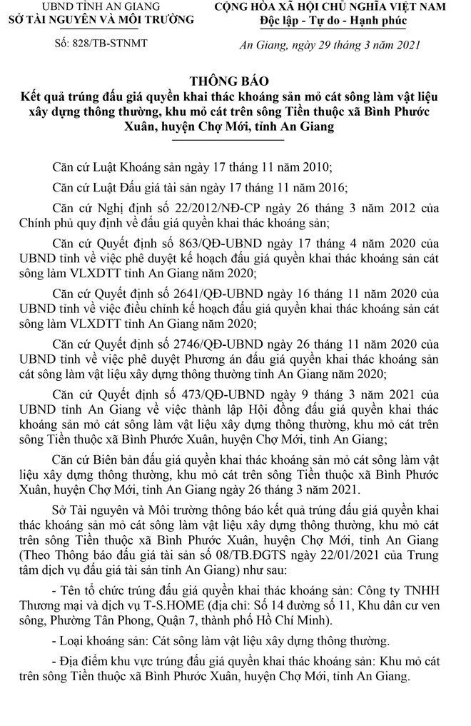 Được biết, sau khi trúng đấu giá, T-S Home vẫn chưa liên hệ với tỉnh. Trả lời CAND, ông Nguyễn Việt Trí, Giám đốc Sở Tài nguyên và Môi trường tỉnh An Giang nhận định: "Rất nhiều khả năng doanh nghiệp này sẽ bỏ quyền khai thác cát".