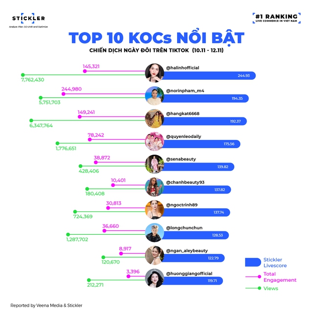 Qua theo dõi hơn 200 tài khoản TikTok Shop trong chiến dịch khuyến mãi ngày Lễ độc thân 11-11, nền tảng Stickler và Veena Media ghi nhận tổng cộng 464 buổi livestream với 1.981 giờ livestream từ 10-11 đến 12-11 nhân sự kiện "Ngày đôi mùa" khuyến mãi lớn nhất cuối năm.
