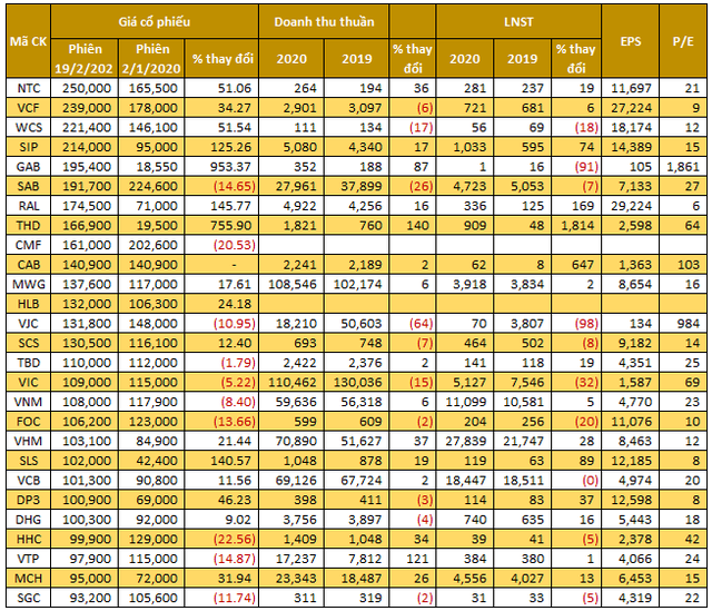 Ngoài ra các cổ phiếu RAL, SLS ghi nhận mức tăng giá trên 140%, các cổ phiếu SIP, WCS, NTC và DP3 cũng có mức tăng giá ấn tượng từ 46% - trên 50% trong đó nhờ mức tăng giá cao này giúp Nam Tân Uyên (NTC) soán ngôi của VCF trở thành cổ phiếu có thị giá cao nhất sàn niêm yết tại thời điểm này - Kể từ đầu năm 2020, cổ phiếu NTC giao dịch khởi sắc và liên tục tăng giá lên vùng giá cao nhất kể từ khi giao dịch trên thị trường UPCoM.