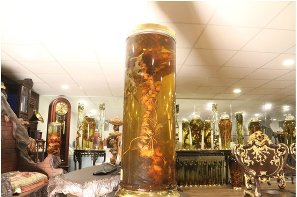 Người này cũng sở hữu hàng chục bình rượu ngâm sâm Ngọc Linh, trong đó có cả sâm tự nhiên và sâm trồng. Trong đó, nhiều bình rượu sâm có giá trị tương đương với một chiếc ô tô hạng sang.