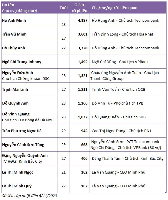 Một số cái tên khác đáng chú ý xuất hiện trong danh sách là Trịnh Mai Linh - con gái ông Trịnh Văn Tuấn, Chủ tịch Ngân hàng TMCP Phương Đông (OCB); Đỗ Quỳnh Anh - con gái ông Đỗ Anh Tú, Phó Chủ tịch Ngân hàng TMCP Tiên Phong (TPBank); ông Đỗ Vinh Quang - con trai ông Đỗ Quang Hiển, Chủ tịch Ngân hàng TMCP Sài Gòn - Hà Nội (SHB); ...