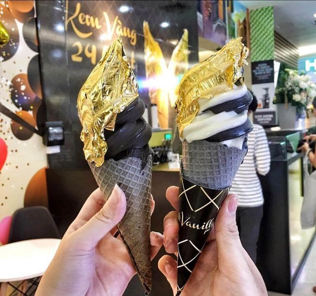 Kem dát vàng là một trong những món ăn độc đáo từng “gây bão” ở Sài thành từ năm 2017. Năm 2019, món ăn xa xỉ này được ra mắt tại Hà Nội. Tại Hà Nội, một chiếc kem ốc quế phủ kín vàng 24K có giá 249.000 đồng, nếu chỉ phủ một nửa vàng thì giá là 149.000 đồng. Tại Sài Gòn, một cây kem dát vàng có giá khoảng 150.000 đồng.
