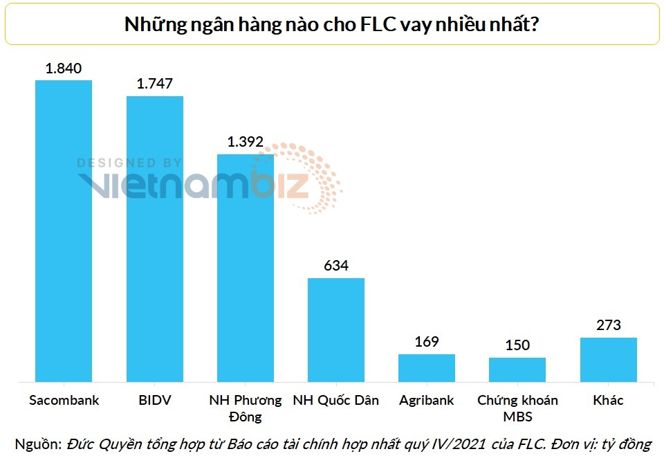 Chủ nợ lớn nhất của Tập đoàn FLC tại ngày 31/12/2021 là Ngân hàng TMCP Sài Gòn Thương Tín (Sacombank) với tổng dự nợ ngắn hạn cũng như dài hạn là hơn 1.840 tỷ đồng. Chỉ đứng sau Sacombank, BIDV cũng cho FLC vay hơn 1.747 tỷ đồng, OCB (1.392 tỷ), NCB (634 tỷ), Agribank (169 tỷ).