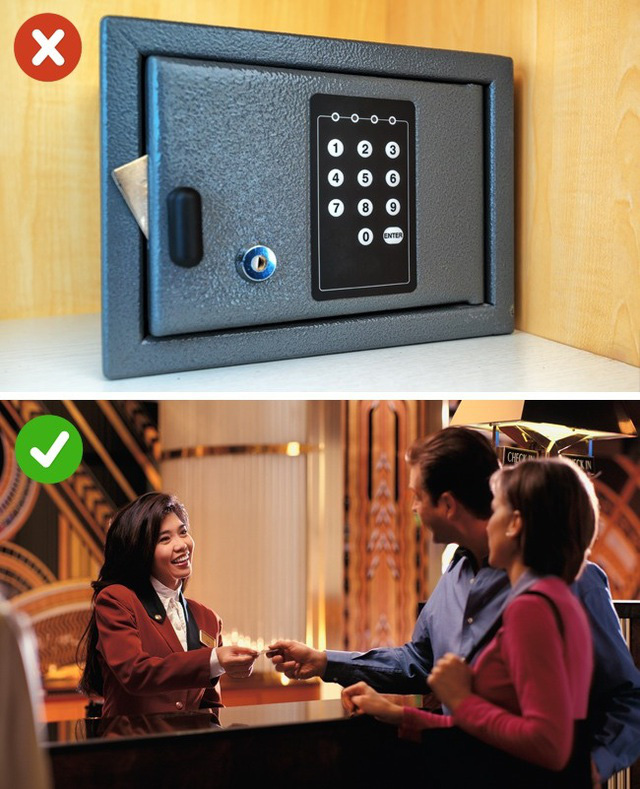 Nhiều khách sạn còn trang bị cả két sắt nhỏ trong phòng để khách tự bảo quản những vật dụng quan trọng, đắt tiền. Nhưng nếu mang theo những thứ đặc biệt có giá trị, bạn nên gửi lại ở quầy lễ tân và nhận biên lai.