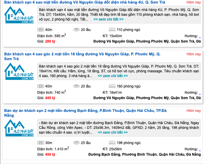 Tương tự, chủ khách sạn trên đường Võ Nguyên Giáp rao bán khách sạn 16 tầng, 120 phòng, diện tích 450m2 giá 320 tỷ. Khách sạn được quảng cáo có nhà bếp, phòng ăn, sân thượng, chỗ để xe hơi,... Theo người bán, khách sạn mới được khai thác từ năm 2018 đến nay, lượng khách ổn định, công suất phòng mùa cao điểm là 98% còn mùa thấp điểm là 75%.