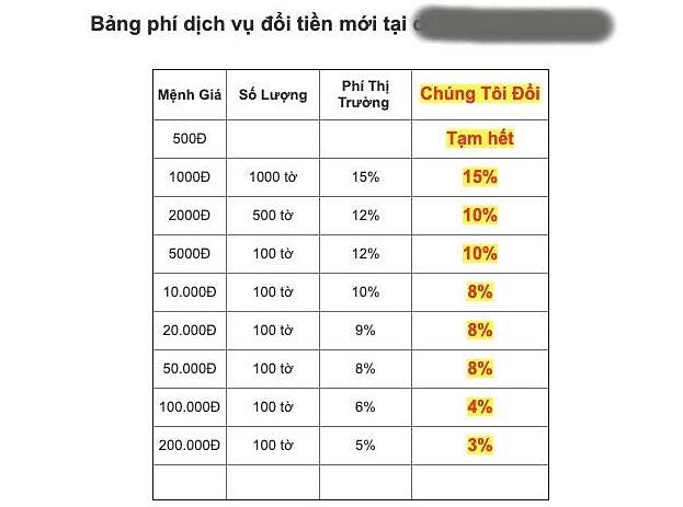 Hầu hết đại lý đều công khai phí tương đương nhau, khoảng 8-15% giá trị số tiền được đổi. Tuy nhiên, phí đổi đang biến động liên tục, tùy thời điểm và mức độ hút hàng của mệnh giá. Do đó, các đại lý thường hỏi khách về loại mệnh giá và số lượng cần đổi để báo giá chính thức.
