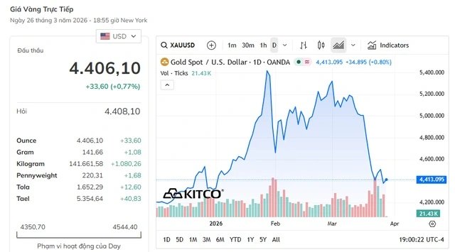 Thị trường kim loại quý toàn cầu tiếp tục ghi nhận diễn biến điều chỉnh mạnh trong phiên giao dịch ngày 27/3. Theo cập nhật mới nhất, giá vàng thế giới đã giảm sâu về quanh ngưỡng 4.400 USD/ounce, đánh dấu một nhịp suy yếu đáng chú ý sau giai đoạn biến động mạnh trước đó.