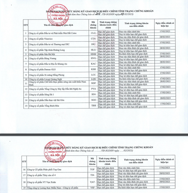 Cũng trong công bố mới nhất của HNX, VSF, LQN và HNM được đưa ra khỏi diện chứng khoán bị hạn chế giao dịch. Thời gian áp dụng từ ngày 17/2 tới.
