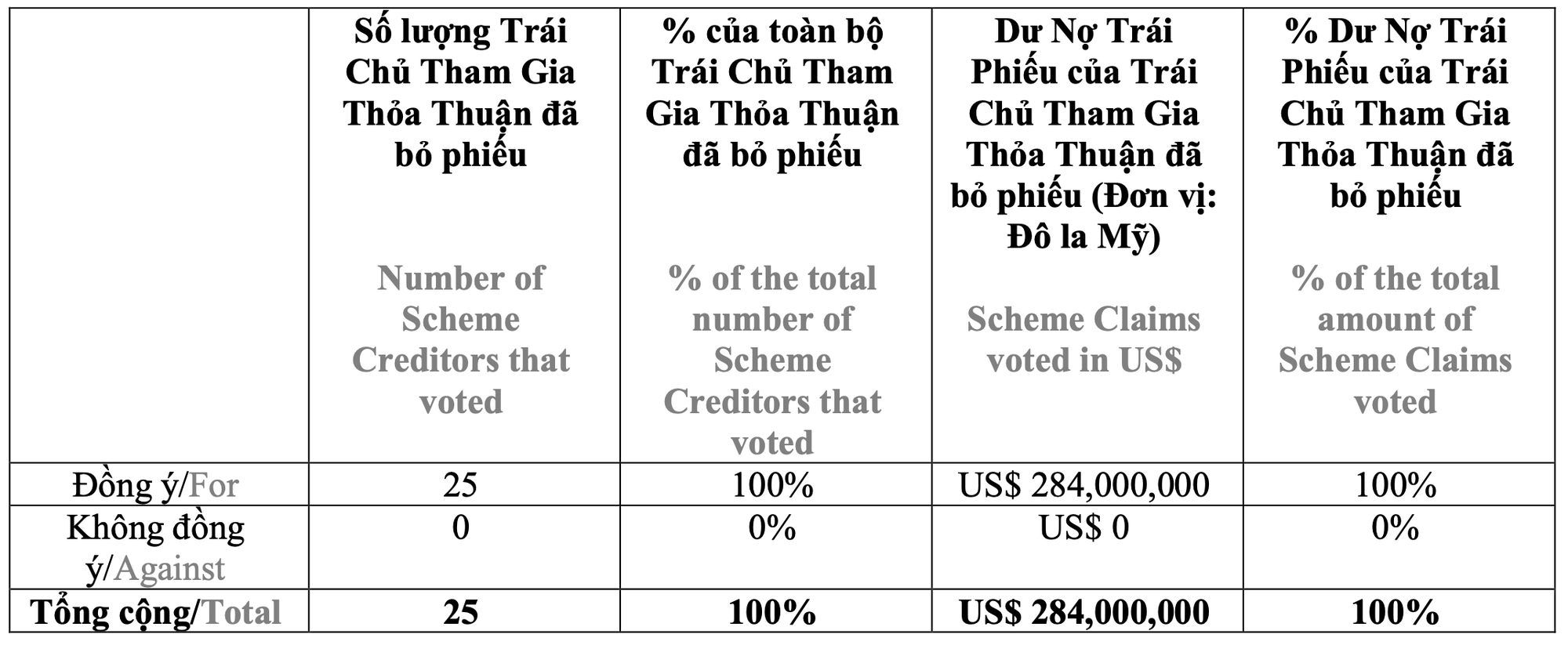 Tổng số trái chủ tham gia thỏa thuận phản hồi đề nghị bỏ phiếu là 25. Tất cả các lá phiếu của họ là hợp lệ và được thống kê trong bảng kết quả bỏ phiếu ở trên dư nợ trái phiếu tối đa của trái chủ tham gia thỏa thuận có quyền bỏ phiếu cho thoả thuận dàn xếp là 298,6 triệu USD. Trong đó, tổng dư nợ trái phiếu của trái chủ tham gia thỏa thuận đã bỏ phiếu cho thoả thuận dàn xếp là 284 triệu USD (hay 95,11% của dư nợ trái phiếu tối đa).