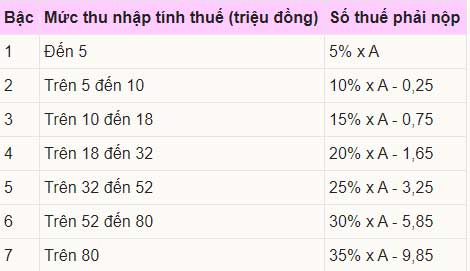 Theo luật hiện hành, cách tính thuế với tiền lương, tiền công dựa trên biểu luỹ tiến từng phần, tức là mỗi bậc thu nhập có một thuế suất tương ứng sau: