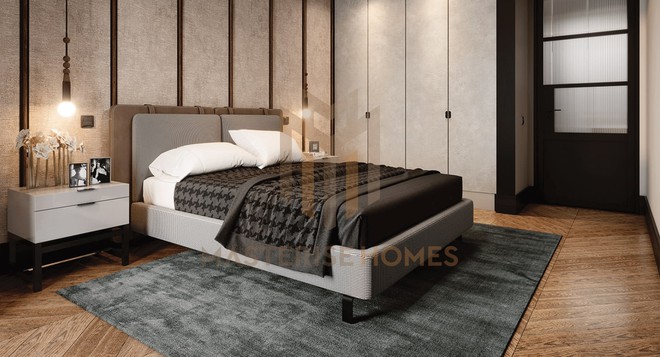 3 phòng ngủ của ngôi nhà đều được thiết kế theo một công thức chung, tông màu nâu xám nhã nhặn, trang bị đầy đủ nội thất, sang trọng tới từng món đồ nhỏ như ga gối, đèn ngủ v.v...