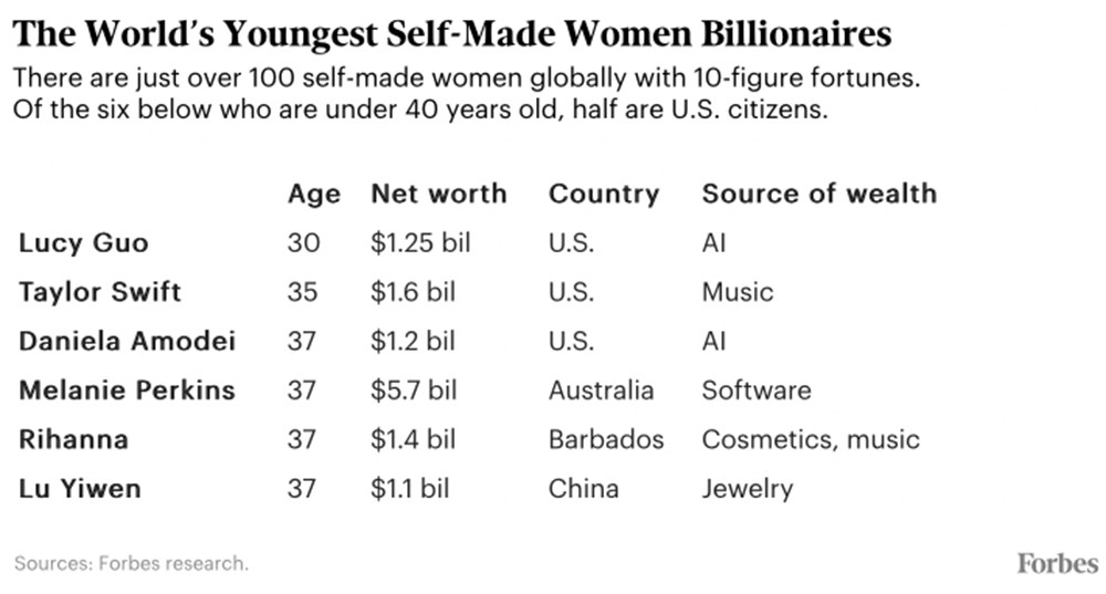 Theo Forbes, Lucy Guo (sinh năm 1994) đã vượt qua Taylor Swift để trở thành nữ tỷ phú tự thân trẻ nhất ở tuổi 30.