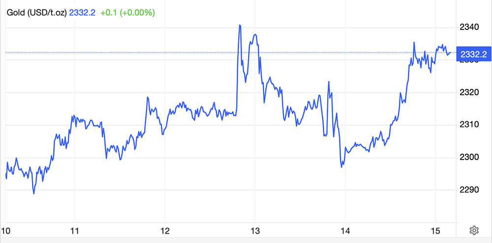 Sau báo cáo CPI của Mỹ công bố, giá vàng giao ngay tăng từ mức 2.313 USD/ounce lên 2.336,72 USD/ounce. Phiên sau đó, giá vàng thế giới giảm, chốt lại tuần giao dịch ở ngưỡng 2.332,8 USD/ounce.
