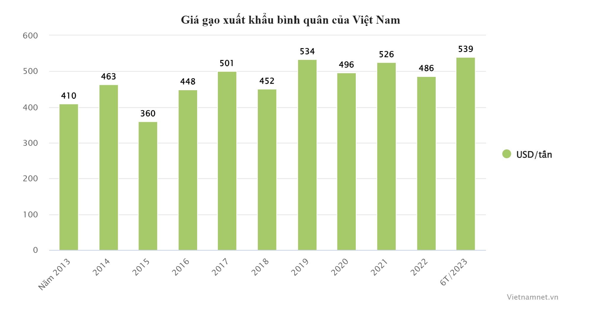 Giá gạo xuất khẩu bình quân 6 tháng đầu năm 2023 ước đạt 539 USD/tấn, tăng 10,2% so với cùng kỳ năm 2022. Đây cũng là mức giá xuất khẩu cao nhất 10 năm qua của hạt gạo Việt.