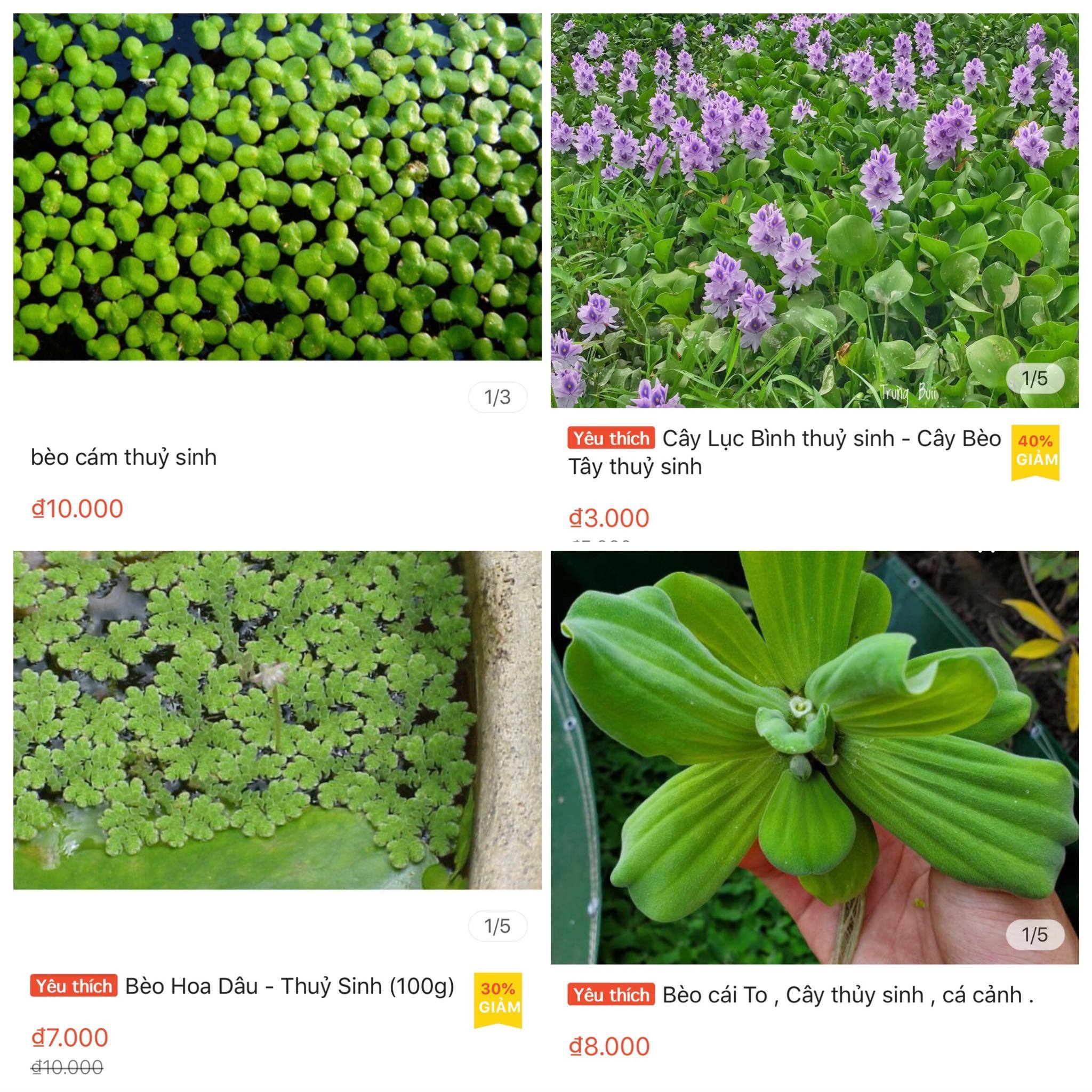 Tương tự, trên một ứng dụng thương mại điện tử, bèo cũng được bán khá nhiều. Đơn cử 1 cây bèo cái to dùng cho thuỷ sinh có giá 8.000 đồng, bèo hoa dâu 7.000 đồng/100g. Trong khi đó, lục bình đang được bán khuyến mại với giá 3.000 đồng/cây.