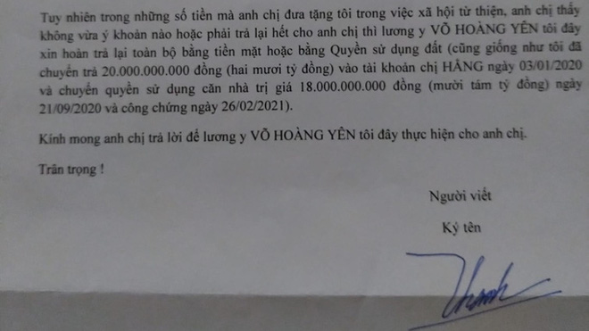......... Tuy nhiên trong những số tiền mà anh chị đưa tặng tôi trong việc xã hội từ thiện, anh chị thấy không vừa ý khoản nào hoặc phải trả lại hết cho anh chị thì lương y Võ Hoàng Yên tôi đây xin hoàn trả lại toàn bộ bằng tiền mặt hoặc bằng quyền sử dụng đất (cũng giống như tôi đã chuyển trả 20 tỷ đồng vào tài khoản chị Hằng ngày 03/01/2020 và chuyển quyền sử dụng căn nhà trị giá 18 tỷ đồng ngày 21/09/2020 và công chứng ngày 26/02/2021).