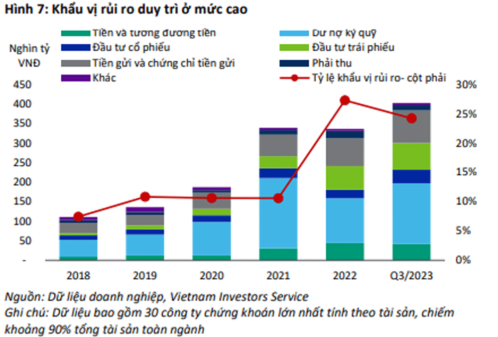 Dù vậy, theo VIS Rating, quy mô đầu tư các tài sản có nhiều rủi ro của toàn ngành chứng khoán vẫn ở mức cao và chiếm 24% tổng tài sản hữu hình, đặc biệt khi các công ty hoạt động trong lĩnh vực tư vấn trái phiếu đã tăng tỷ lệ nắm giữ trái phiếu doanh nghiệp rủi ro trong 9 tháng đầu năm 2023.