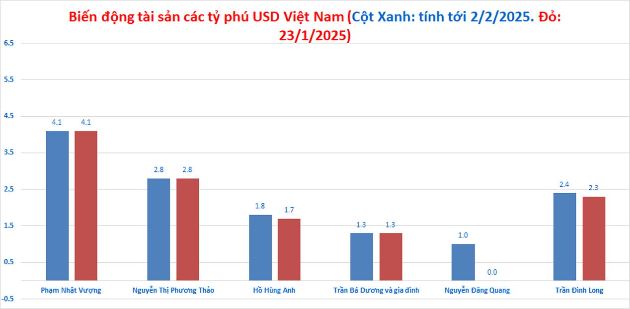 Vị trí trong bảng xếp hạng của nhiều tỷ phú Việt Nam trên Forbes suy giảm do thế giới ghi nhận số phiên cổ phiếu tăng điểm nhiều hơn so với giảm trong khoảng thời gian Việt Nam nghỉ Tết. Mức thay đổi không nhiều, các tỷ phú Việt Nam vẫn nằm ở phía dưới của bảng xếp hạng.