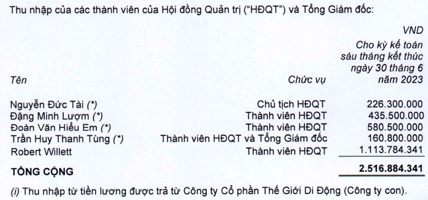 Theo báo cáo tài chính hợp nhất quý 2/2023 của CTCP Đầu tư Thế Giới Di Động (mã MWG), Chủ tịch HĐQT Nguyễn Đức Tài có thu nhập 226,3 triệu đồng trong nửa đầu năm, tương đương khoảng 37,7 triệu đồng/tháng. Như vậy, ông Tài là người có thu nhập thấp thứ 2 trong các lãnh đạo cấp cao của doanh nghiệp bán lẻ này, chỉ cao hơn Tổng Giám đốc Trần Huy Thanh Tùng.
