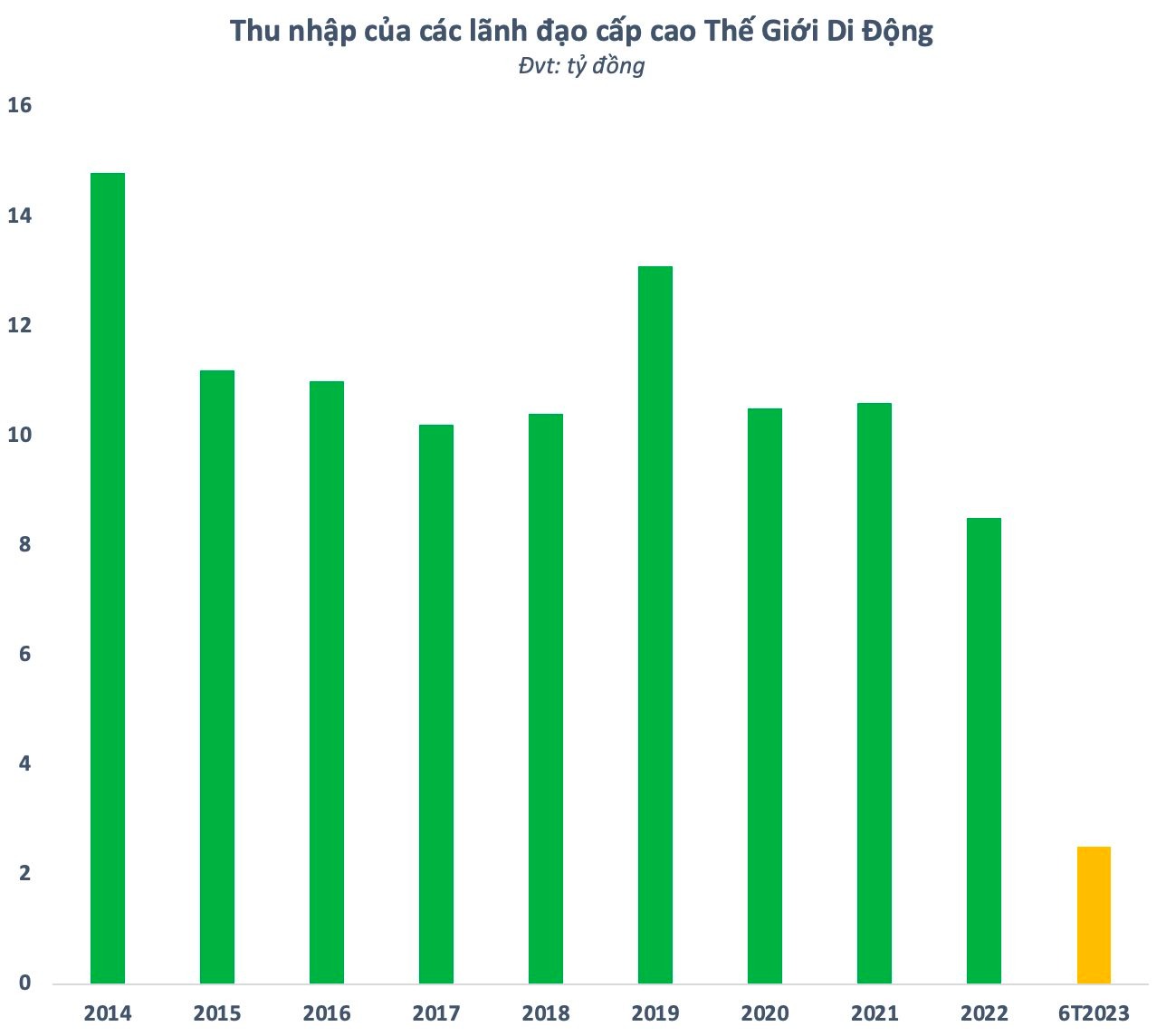 Tình hình kinh doanh khó khăn đã ảnh hưởng không nhỏ đến thu nhập của lãnh đạo doanh nghiệp. Năm ngoái, tổng thu nhập của các thành viên HĐQT và Tổng Giám đốc Thế Giới Di Động đã giảm hơn 2 tỷ so với năm 2021, xuống mức 8,5 tỷ đồng. Đây là mức thu nhập thấp nhất của các lãnh đạo cấp cao kể từ khi doanh nghiệp bán lẻ này niêm yết năm 2014. Con số này trong nửa đầu năm 2023 chỉ ở mức 2,5 tỷ đồng.