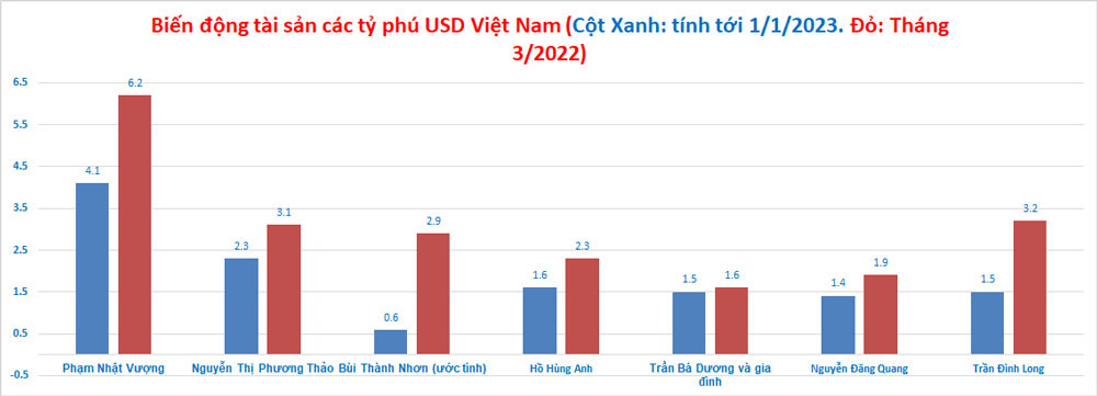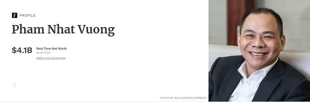 Theo Forbes, tính đến 1/1/2023, Việt Nam chỉ còn 6 tỷ phú USD so với con số 7 người như trong bảng xếp hạng hồi tháng 3/2022. Tổng cộng, 7 tỷ phú này có tài sản giảm tổng cộng 8,2 tỷ USD.