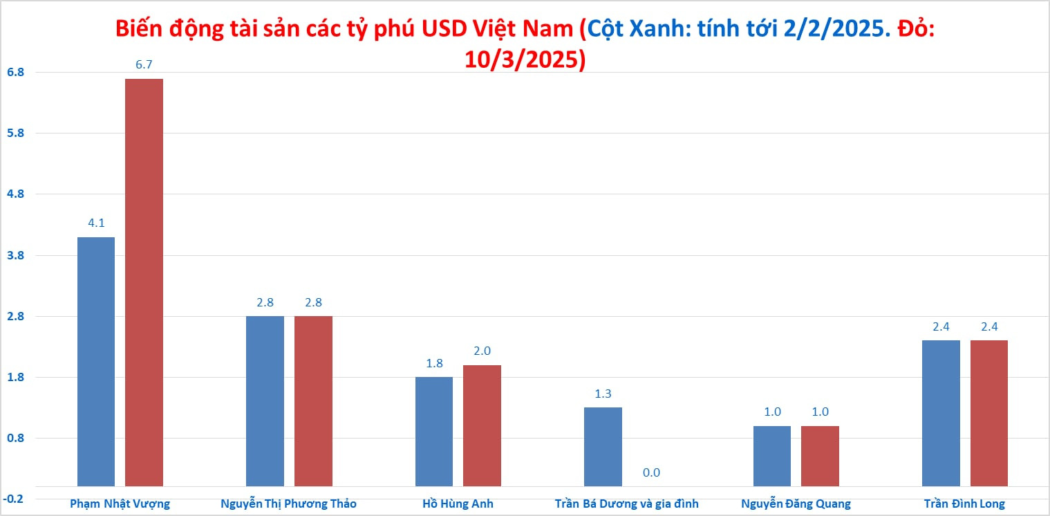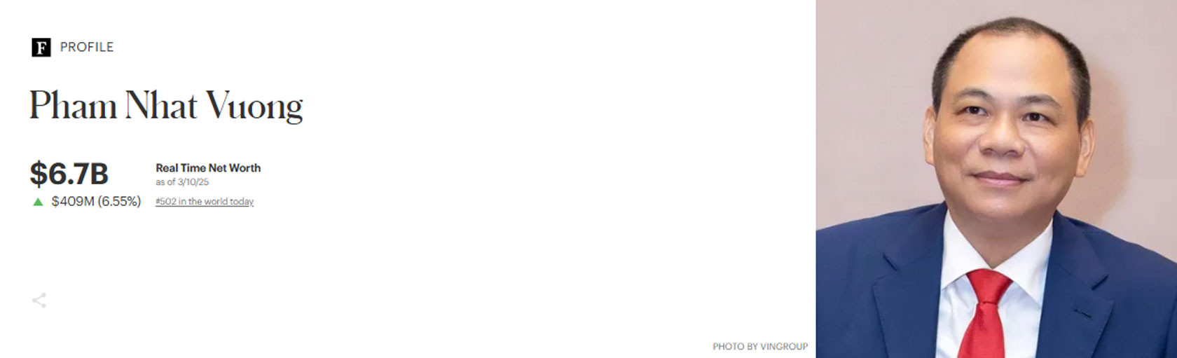 Theo cập nhập mới nhất của Forbes, Việt Nam chỉ còn 5 tỷ phú USD tính đến ngày 10/3, thay vì 6 người như trước đó. Chủ tịch Tập đoàn Vingroup (VIC) kiêm CEO VinFast (VFS) ghi nhận tài sản tăng vọt lên mức cao nhất trong gần 2 năm qua, đạt 6,7 tỷ USD tính tới ngày 10/3. Ông Vượng xếp thứ 502 trên thế giới, so với vị trí 839 ghi nhận hồi gần cuối tháng 1.