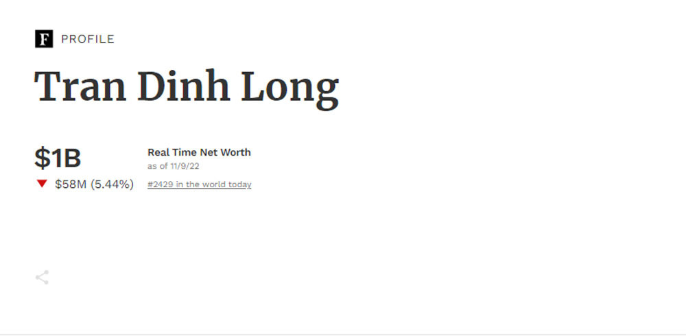 Theo Forbes, tính đến 9/11, ông Trần Đình Long, Chủ tịch Tập đoàn Hòa Phát (HPG) có số tài sản tròn 1 tỷ USD (xếp thứ 2.429 trong danh sách những người giàu nhất trên thế giới), giảm 58 triệu USD so với lần đánh giá trước đó và giảm 2,2 tỷ USD với bảng xếp hạng trong tháng 3/2022.