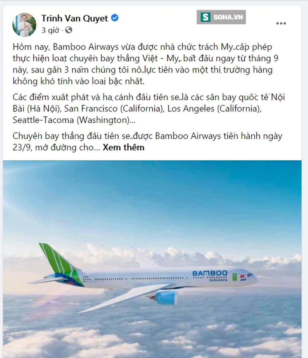 Trên Facebook, ông Trịnh Văn Quyết, Chủ tịch HĐQT Bamboo Airways cho biết: "Hôm nay, Bamboo Airways vừa được nhà chức trách Mỹ cấp phép thực hiện loạt chuyến bay thẳng Việt - Mỹ, bắt đầu ngay từ tháng 9 này, sau gần 3 năm chúng tôi nỗ lực tiến vào một thị trường hàng không khó tính vào loại bậc nhất".