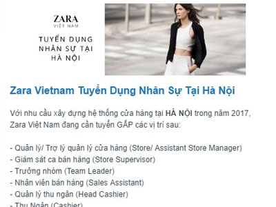 Những ngày gần đây, Zara đã phát đi email tuyển dụng nhân sự cho nhiều vị trí tại Hà Nội khiến các tín đồ thời trang tin rằng hãng sắp mở cửa đầu tiên của mình tại thủ đô.