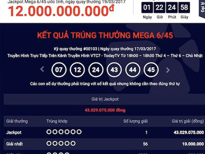 Kỳ quay số mở thưởng sản phẩm Mega 6/45 ngày 17/3 đã xác định một vé trúng giải Jackpot được phát hành tại điểm bán hàng xổ số tự chọn Vietlott tại quận Hoàn Kiếm, Hà Nội.