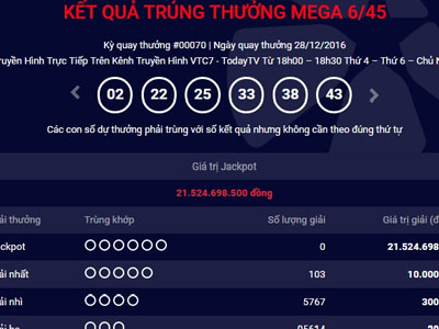 Theo thông tin từ Công ty Xổ số điện toán Việt Nam - Vietlott kết quả kỳ quay thưởng thứ 70 của Xổ số Mega 6/45 với giá trị giải thưởng Jackpot 21.524.698.500 đồng đã kết thúc mà không thể tìm được chủ nhân thứ 9 của giải thưởng độc đắc này.