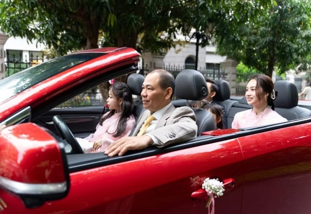 Trong ngày vui của con trai Minh Hoàng và Phương Nhi, tỷ phú Phạm Nhật Vượng gây chú ý khi trực tiếp lái xe mui trần màu đỏ, dẫn đầu đoàn nhà trai đến làm lễ vu quy, tạo nên khoảnh khắc vừa trang trọng vừa gần gũi.