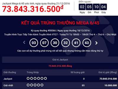 Phiên quay số mở thưởng thứ 66 của Xổ số Mega 6/45 diễn ra ngày 18/12, giá trị giải độc đắc đã tăng từ 57,3 tỷ đồng lên gần 74 tỷ đồng. Tuy nhiên, do vẫn chưa có chủ nhân trúng giải Jackpot nên sẽ được cộng dồn tại kỳ quay tiếp theo với số tiền dự đoán sẽ vượt qua 92 tỷ đồng.