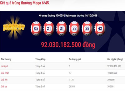 Trang chủ của Vietlott, đơn vị phát hành xổ số kiểu Mỹ đã thông báo có một người trúng giải độc đắc 92 tỷ đồng trong kỳ quay ngày 16/10.