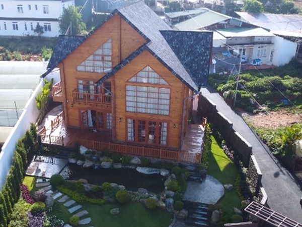 Nằm trong khu vực đắc địa tại Đà Lạt, căn biệt thự được làm hoàn toàn bằng gỗ thông nguyên khối, gồm 1 trệt, 1 tầng, và 1 tầng áp mái.