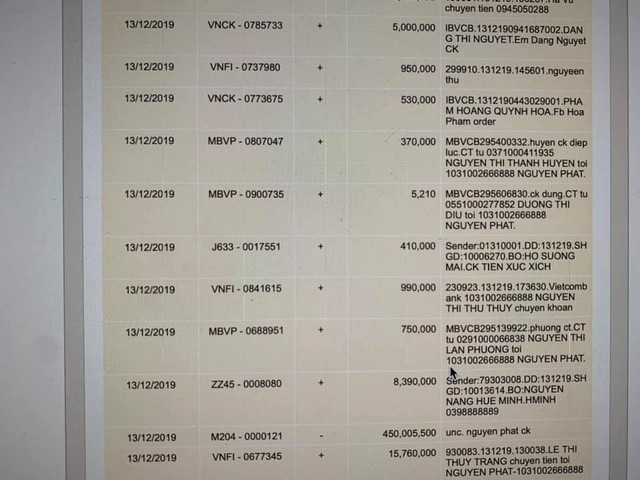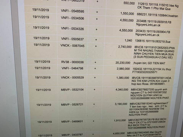 "Tôi rà soát lại giao dịch tiền trên internet banking thì phát hiện số tài khoản của Nguyễn Hoa, Lan Phạm với số tài khoản của một nữ khách hàng ở chung cư 136 Hồ Tùng Mậu đang nợ tiền hàng của tôi đều là một người, cùng một số tài khoản. Tôi chỉ tính sơ trong năm 2019, với những giao dịch thiếu chữ cái ở tên người thụ hưởng thì tôi đã bị thiệt hại hơn 50 triệu đồng. Đó là chưa kể những giao dịch năm 2017, 2018 và những giao dịch mà tài khoản N.H chuyển tiền mua hàng thiếu 3 số 0 ở đằng sau số tiền gửi", chị Dung bức xúc.