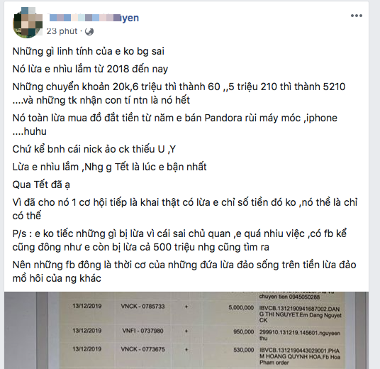 Chị Dung cho biết thêm: "Tài khoản N.H mua rất nhiều hàng của tôi nhưng khi chuyển khoản lại ghi thiếu 3 số 0 đằng sau số tiền cần gửi. Ví dụ như món hàng có giá trị "năm triệu ba trăm mười lăm ngàn" thì người này lại thường xuyên ghi 5.315 đồng. Tài khoản của tôi vẫn cộng tiền nhưng do tôi mất cảnh giác, không xem kỹ nên chỉ nhận mấy ngàn đồng đã chuyển hàng đi cho khách. Tôi liên hệ với người giao hàng của tôi ở Hà Nội thì các đơn hàng của Nguyễn Hoa và Lan Phạm đều ghi địa chỉ một đằng và nhận hàng ở một nẻo".