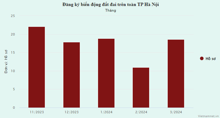 Từ tháng 11/2023-3/2024, trên toàn thành phố, đăng ký biến động đất đai cao nhất vào tháng 11 năm ngoái với hơn 22.000 hồ sơ tiếp nhận giải quyết. Thấp nhất là thời điểm Tết Nguyên đán (tháng 2/2024) với gần 11.000 hồ sơ.