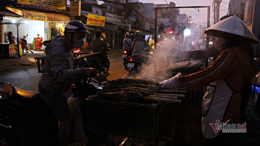 Ngày vía Thần Tài, những hộ kinh doanh món cá lóc nướng trên đường Tân Kỳ- Tân Quý (Quận Tân Phú, TP.HCM) đỏ lửa từ sáng sớm. Trời chưa hửng nắng, những người này đã quạt than, nướng cá cho kịp nhu cầu của khách hàng.