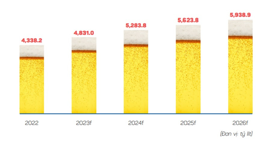 Ngành hàng này dự báo tiếp tục duy trì mức tăng trưởng khoảng 8,2%/năm trong giai đoạn 2022-2026, đạt 4.831 tỷ lít năm 2023, hướng tới gần 6.000 tỷ lít vào năm 2026.